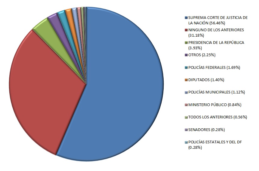 Por contraste, el nivel más alto de confianza correspondió a la Suprema Corte de Justicia de la Nación, misma que sumó un 56.46%.